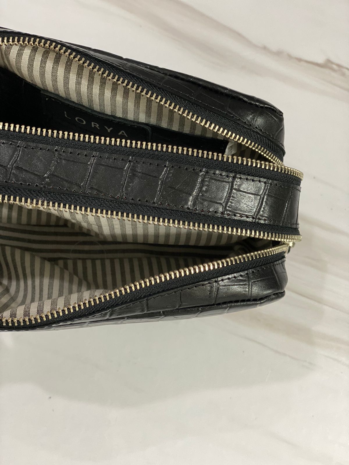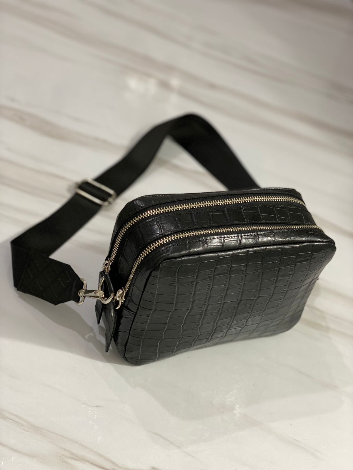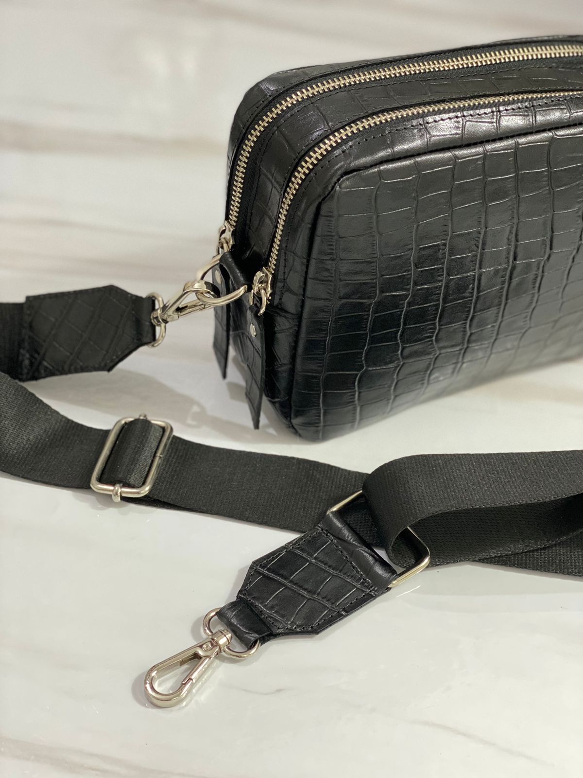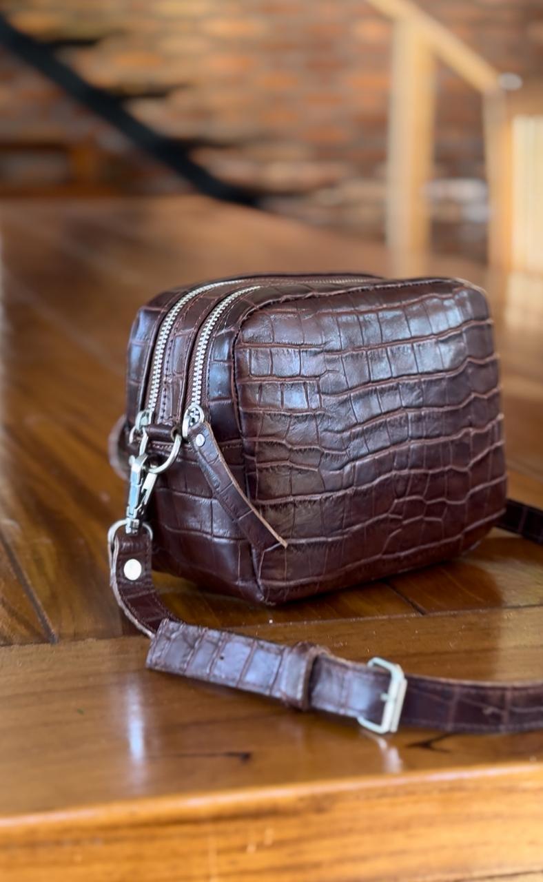 Elaborada en cuero vacuno y herrajes en niquel. Sistema de apertura con doble cierre, en su interior forrada con tela gross con un bolsillo de cuero.