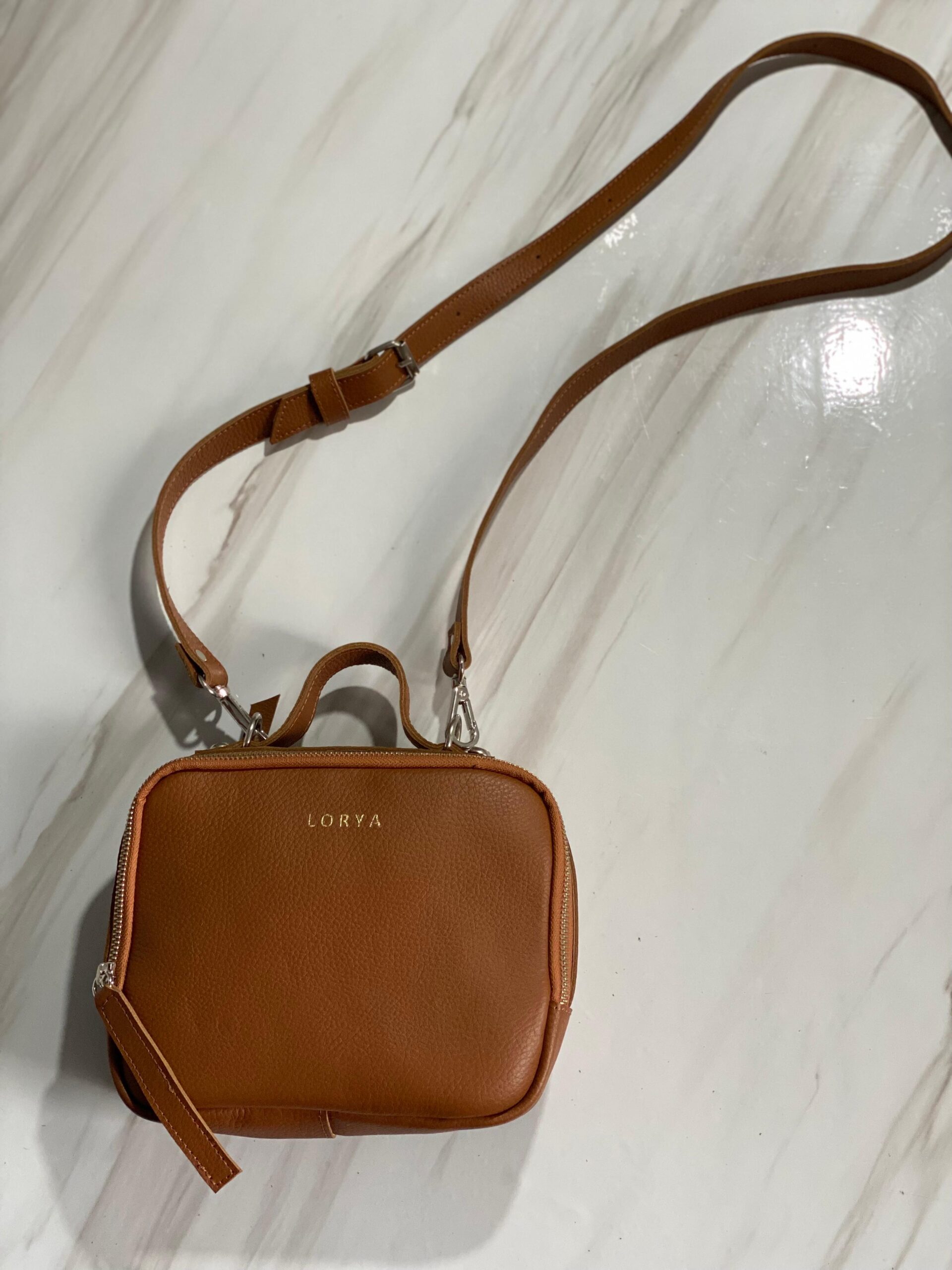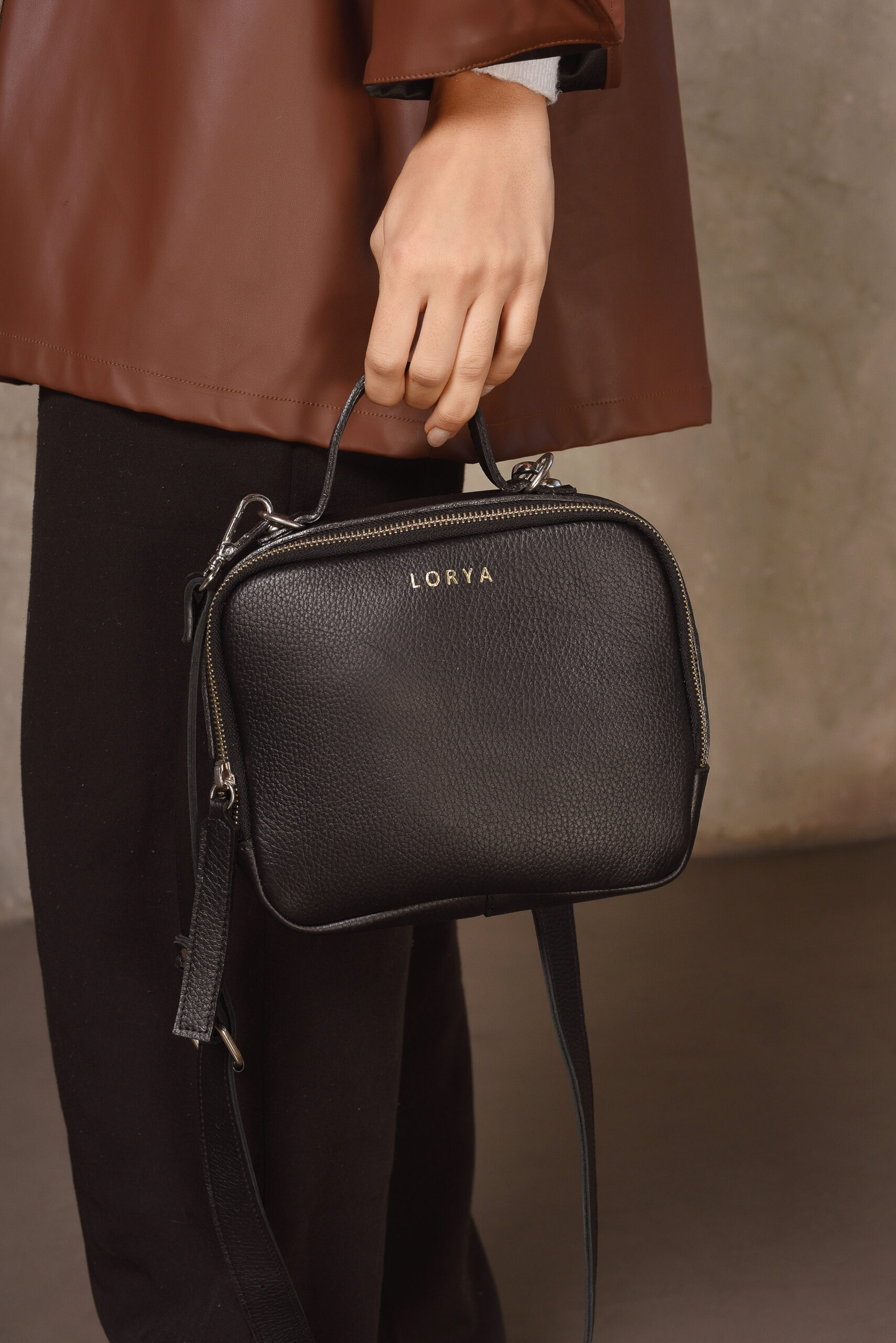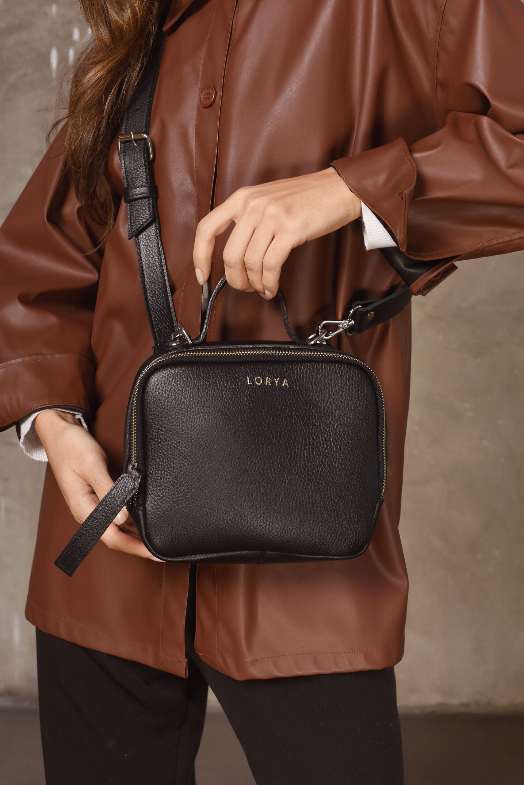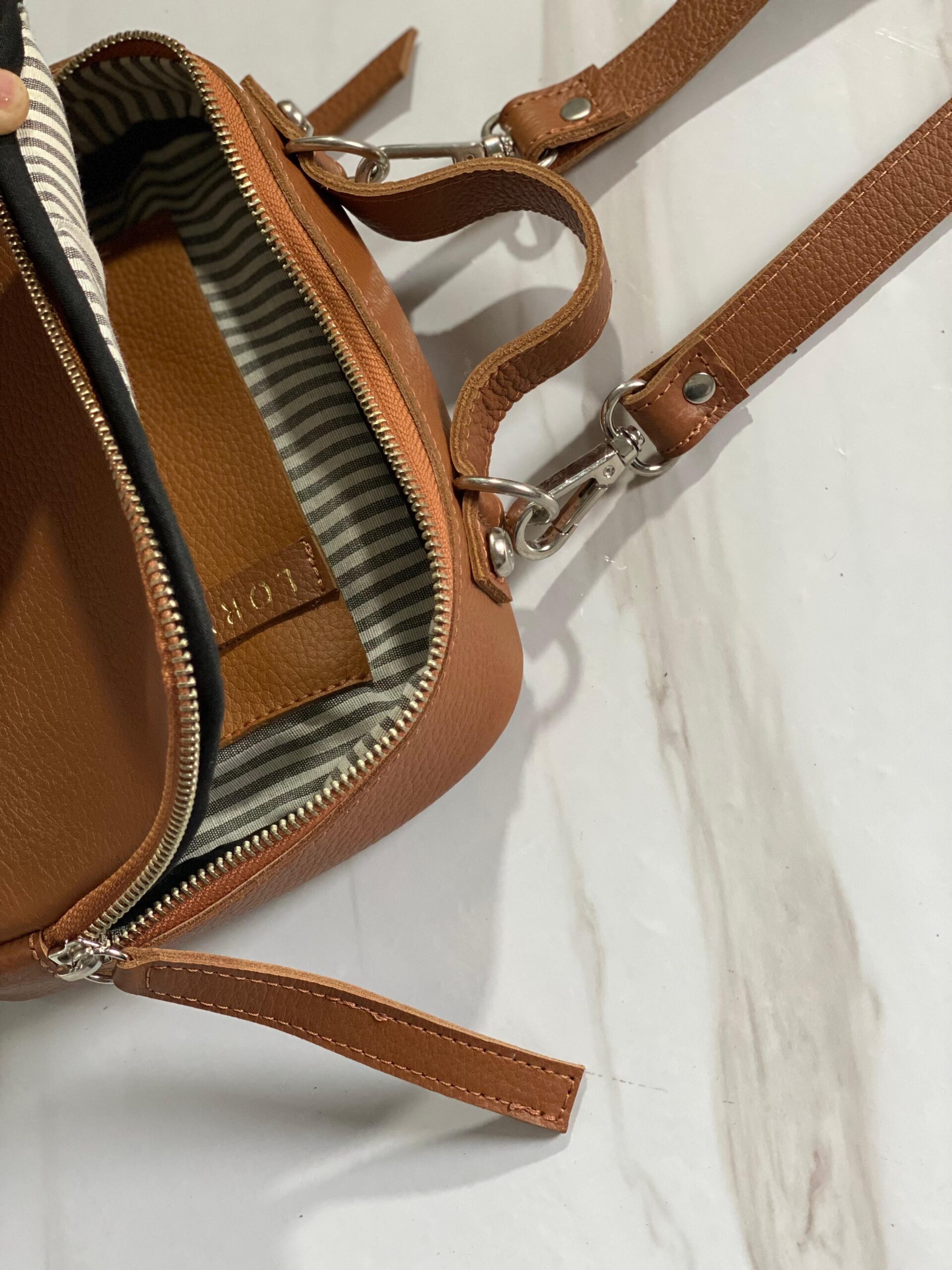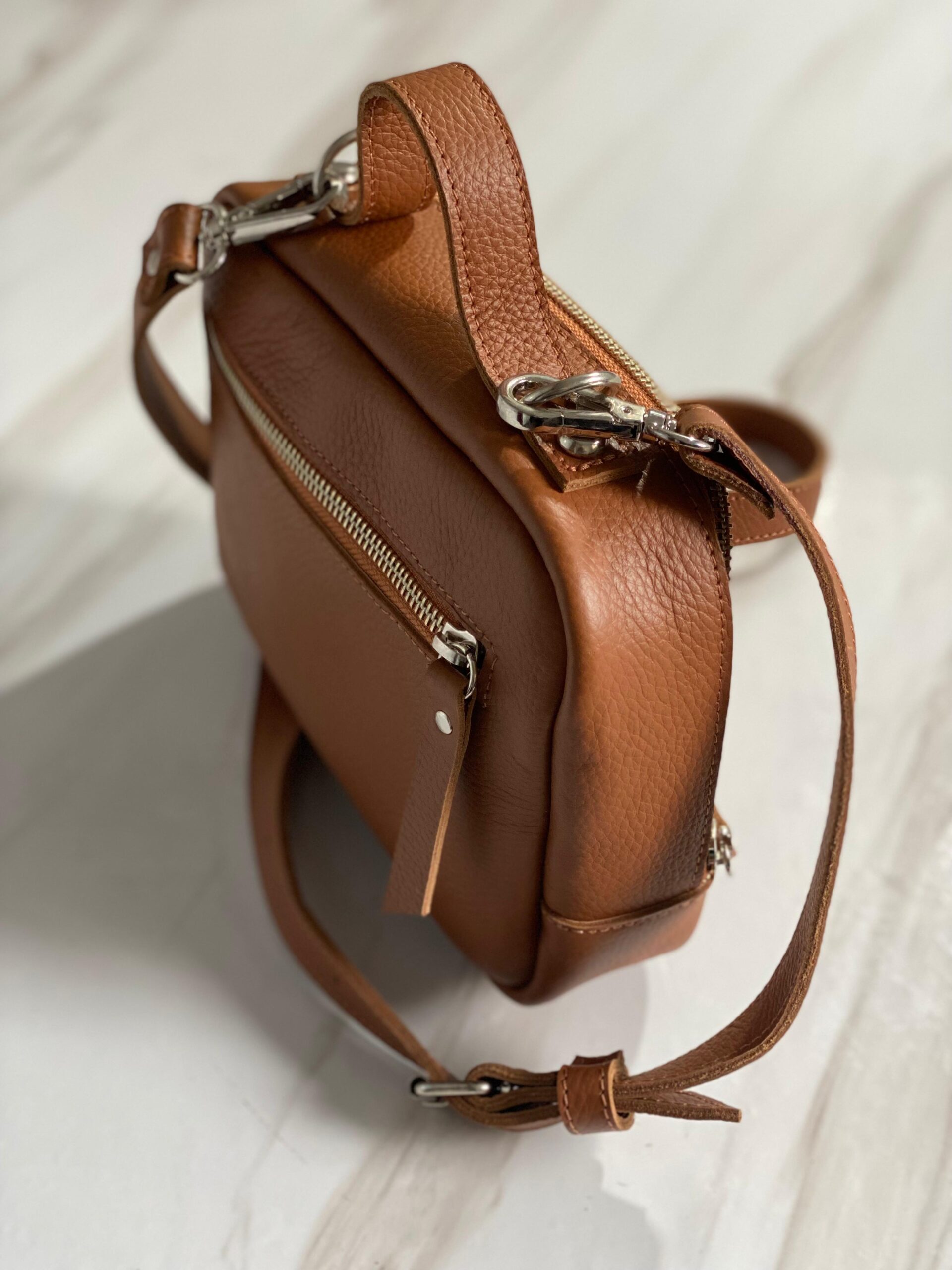 Elaborada en cuero vacuno con herrajes en níquel, forrada por dentro con tela gross. Posee dos bolsillos, uno en su interior de cuero y otro exterior con cierre.