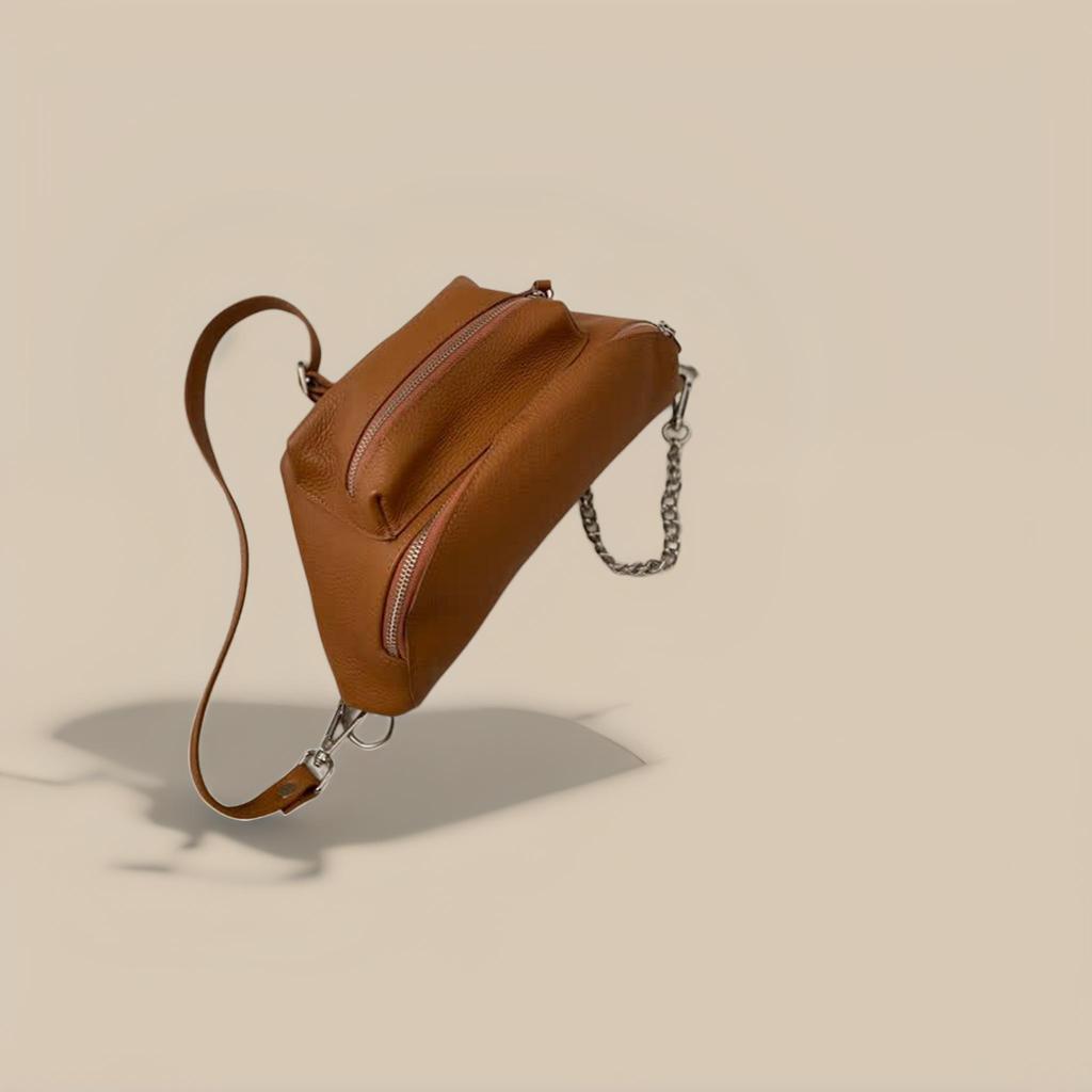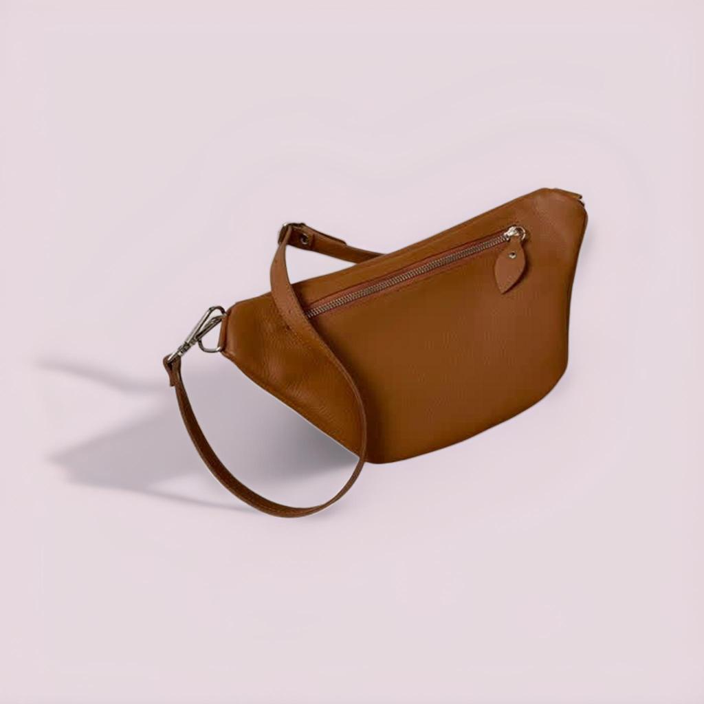 Riñonera confeccionada en cuero vacuno con herrajes en níquel, la misma está forrada por dentro con tela gross, contiene tres bolsillos, uno con cierre frontal, uno en su parte trasera también con cierre y otro de cuero en su interior.