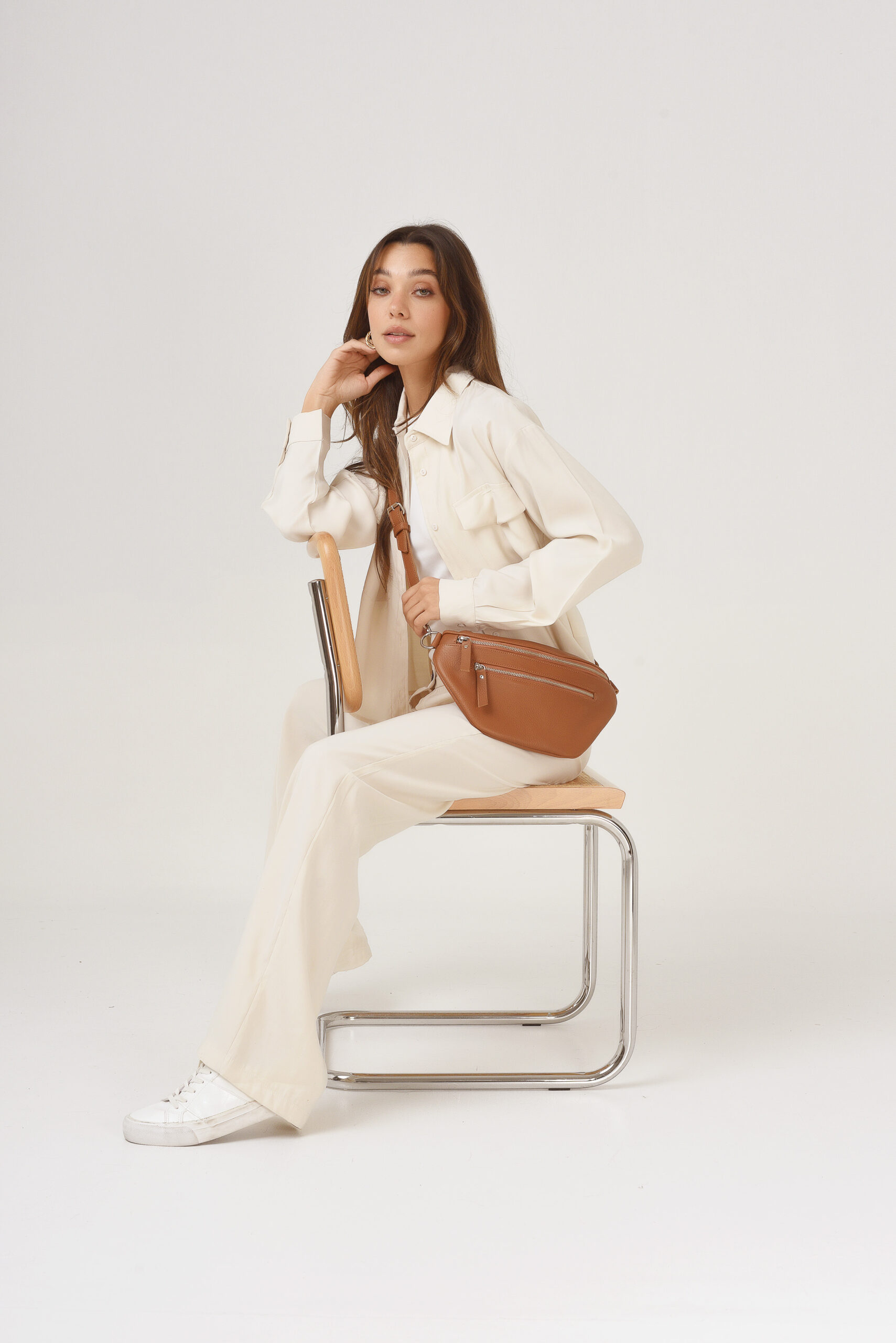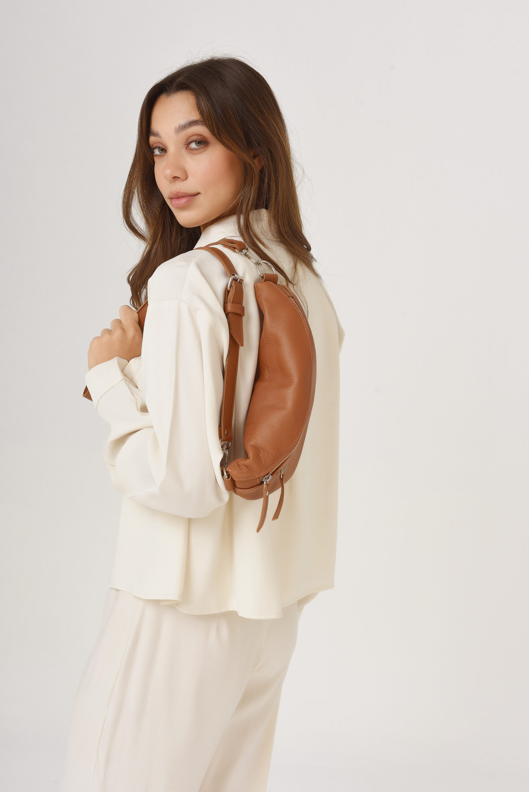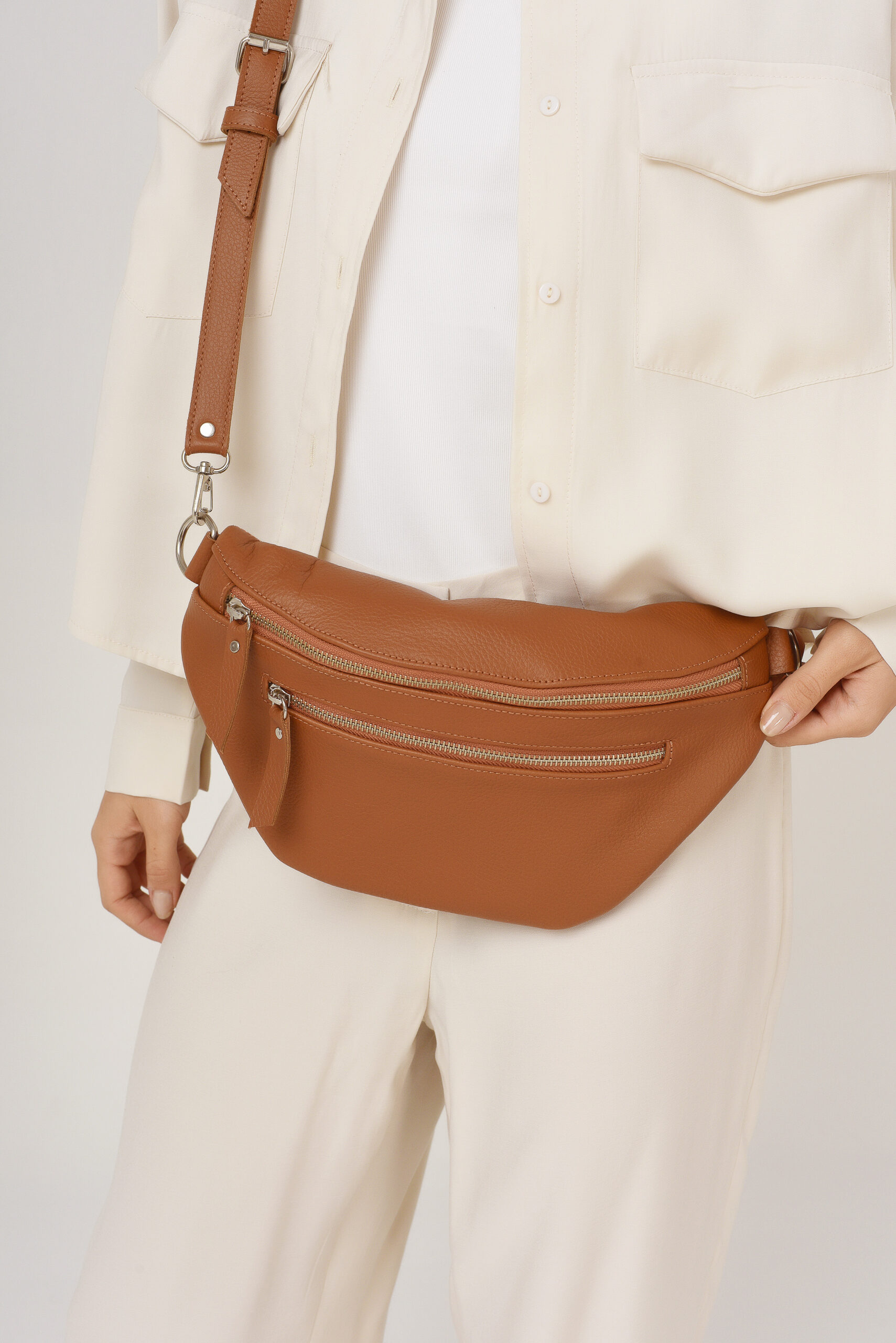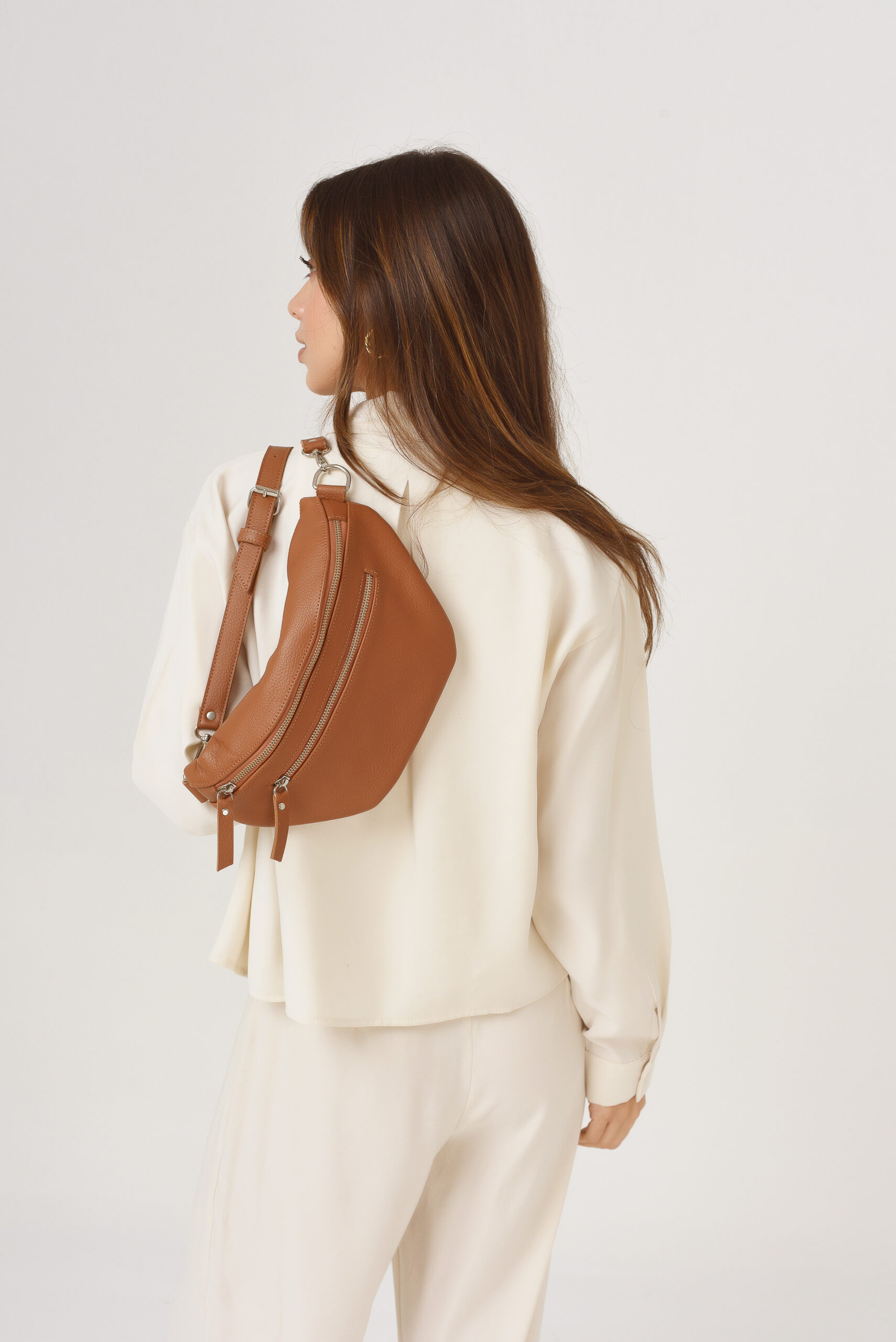 Riñonera confeccionada en cuero vacuno con herrajes en niquel, la misma está forrada por dentro con tela gross, contiene dos bolsillos, uno interno de cuero y otro a la vista en la parte frontal con cierre.