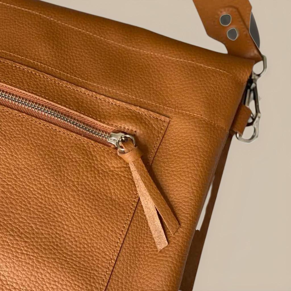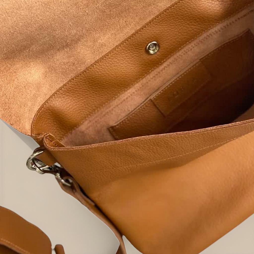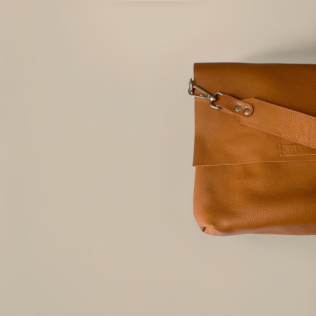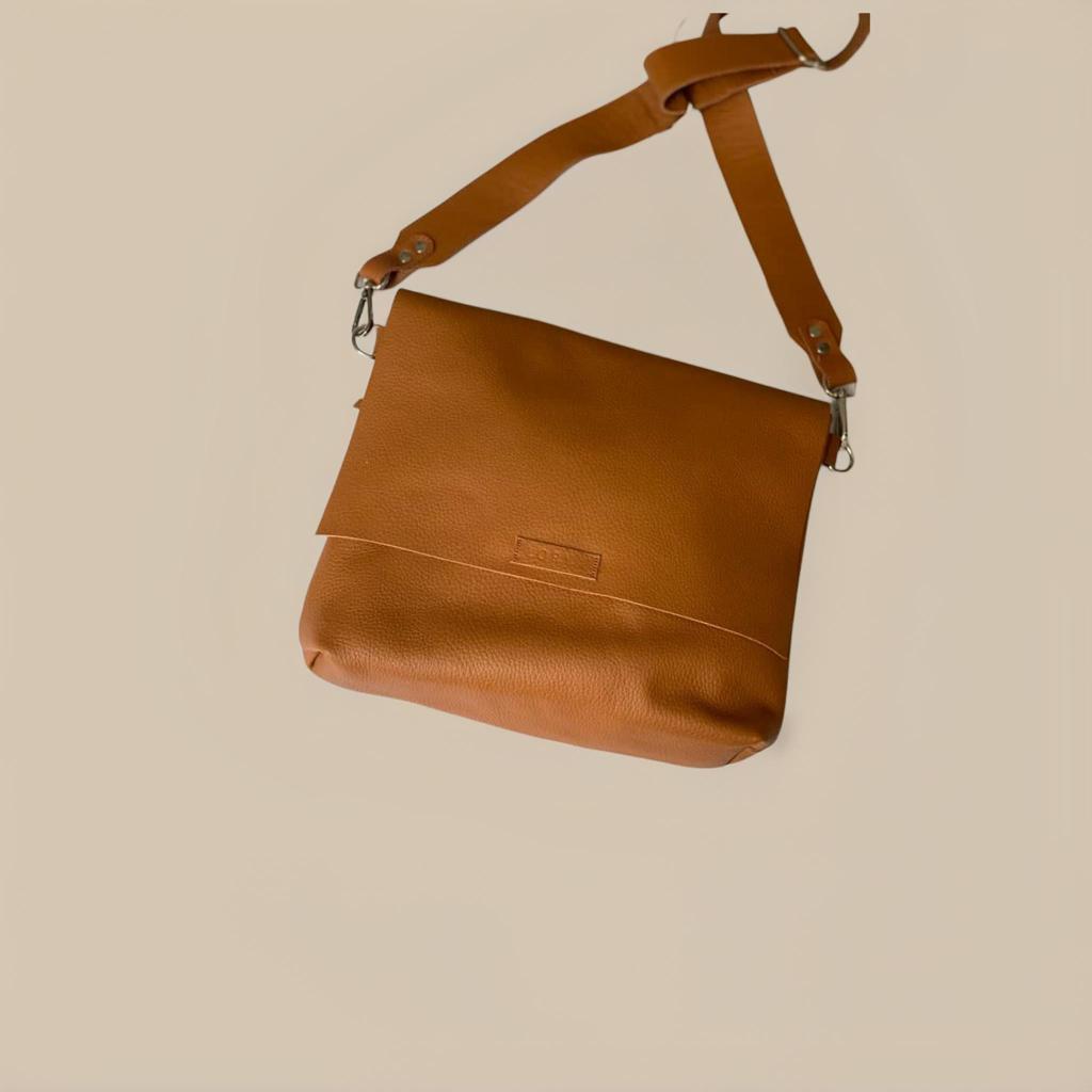 Elaborada en cuero vacuno, sin forro de tela para apreciar la textura del cuero. Contiene un bolsillo amplio con cierre en la parte trasera y un compartimiento de cuero en su interior, incluye llavero, se cierra con brocho imantado.