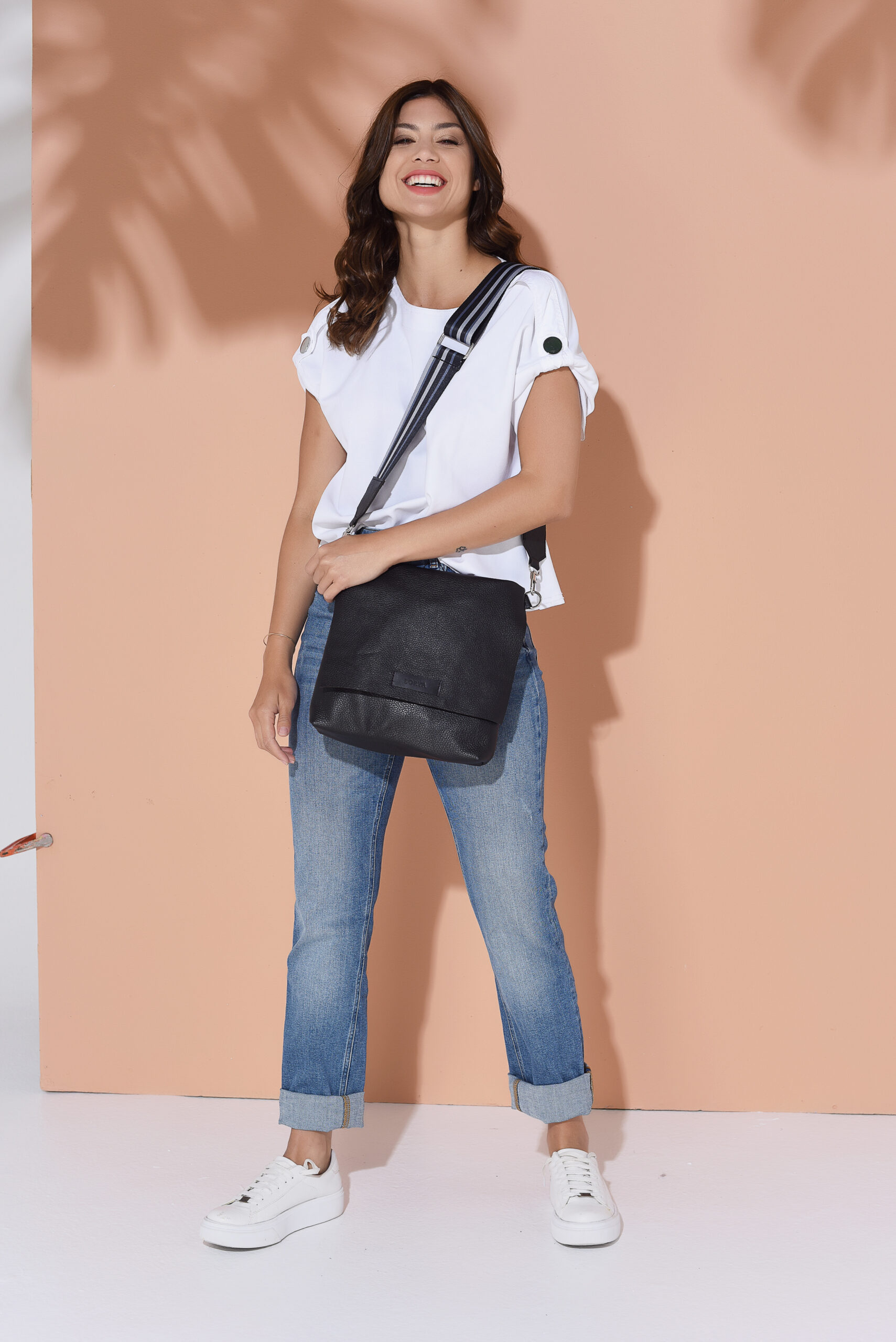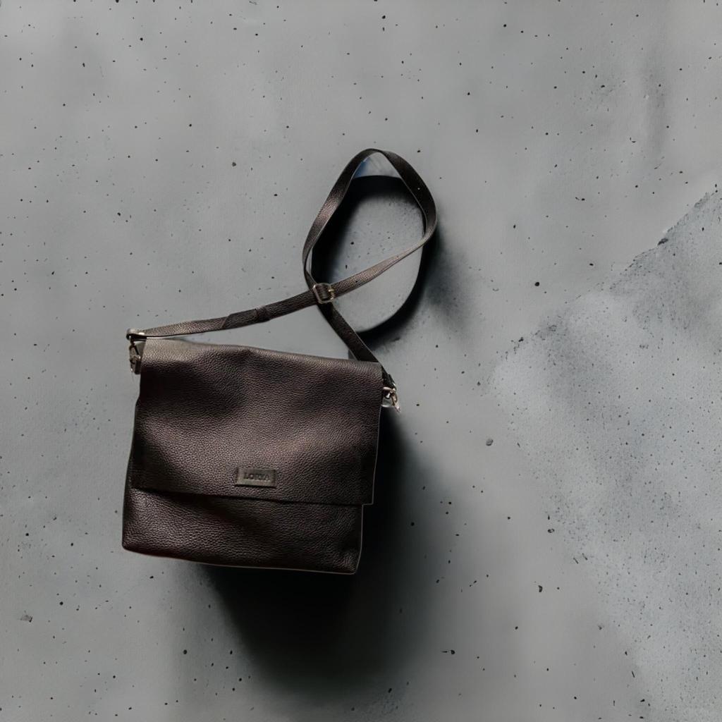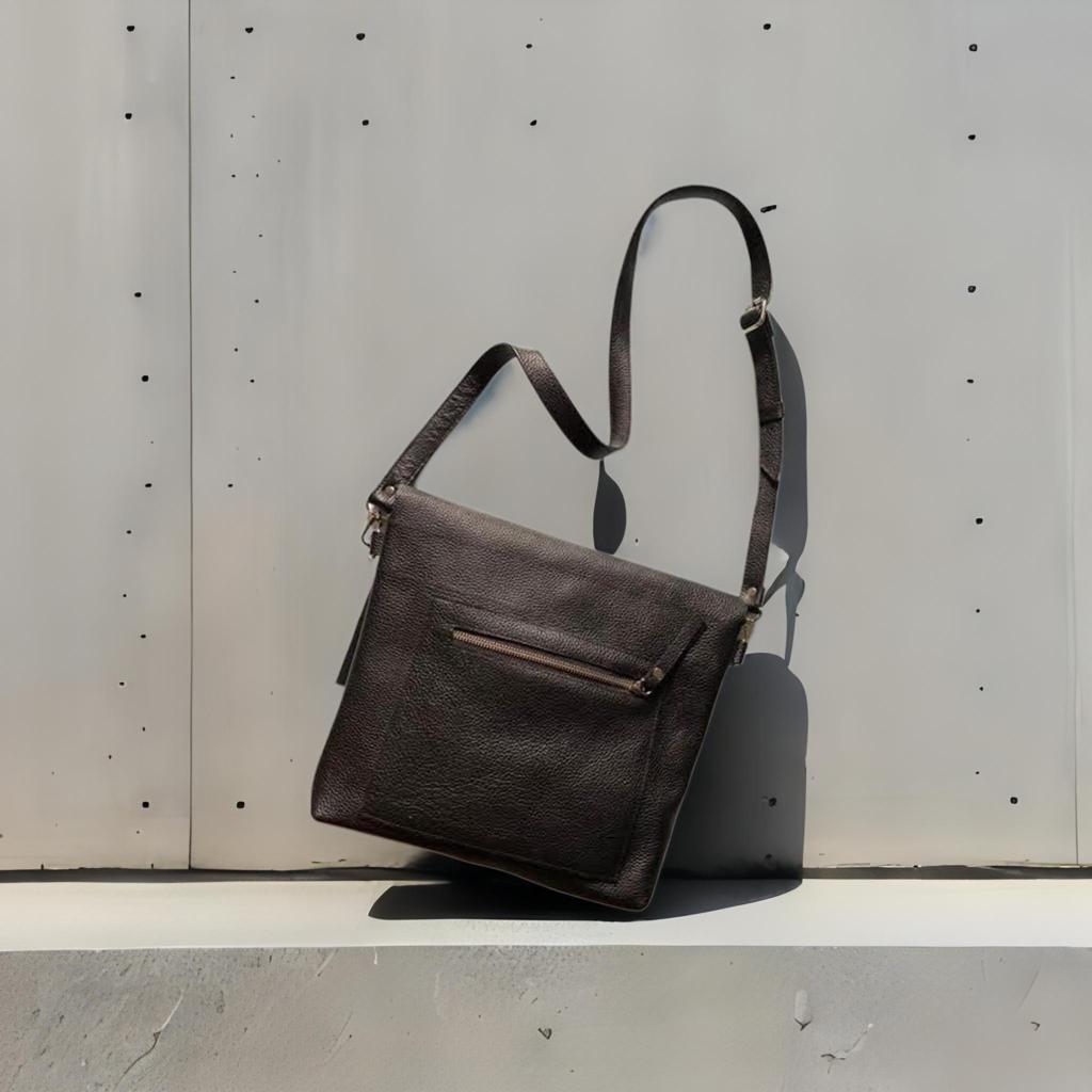 Elaborada en cuero vacuno, sin forro de tela para apreciar la textura del cuero. Contiene un bolsillo amplio con cierre en la parte trasera y un compartimiento de cuero en su interior, incluye llavero, se cierra con brocho imantado.